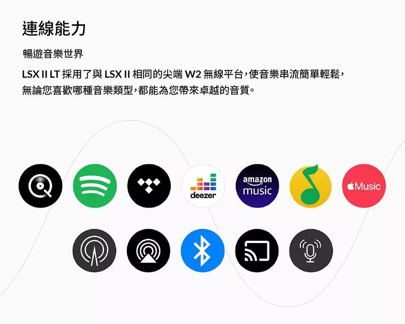 • 無線串流且支援所有主流音樂服務